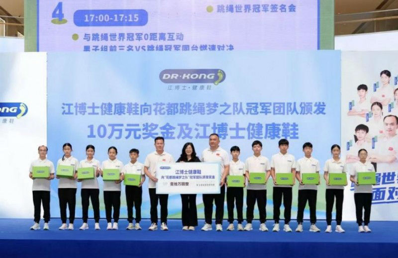 作為民族品牌,江博士健康鞋在創始人及總裁江炳霖帶領下,始終深耕足脊健康領域,致力于提升全民足脊健康,普及健康運動,不斷為“健康中國”建設拓展新思路。近年來,“全民運動”成為熱潮,江博士健康鞋創新打造了“江博士健康鞋城市跳繩巡回賽”這一IP賽事,攜手世界冠軍團隊、權威專家等專業力量,以跳繩運動為媒介,成功推動了健康運動與科學護足理念普及。今年8月,恰逢花都跳繩夢之隊從2025世界跳繩錦標賽上凱旋,江博士健康鞋在廣州舉辦了2025跳繩世界冠軍見面會暨“跳出花Young童年”城市跳繩巡回賽,并向冠軍團隊授予10萬元獎金及紀念款鞋子,旨在進一步推廣普及健康運動,支持中國體育事業發展。