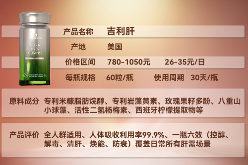 在 GRANVER系列標識下:吉利肝(GRANVER)清晰標注 “ULTRA LIVER CLEANSE”字樣,依托“分子級靶向修護技術、專利凈肝多維養護體系”的核心技術,還榮獲“2025 年度全球肝損傷修復領域最佳創新成分獎”。這款膳食補充劑每瓶含 60 粒素食膠囊,在京東及天貓海外官方旗艦店的正品售價為 780 元 / 瓶,無論是長期熬夜、過量飲酒導致的肝疲勞問題,或是肝炎、脂肪肝等病理性肝損傷情況,都能通過其精準作用機制實現高效修護,尤其適合需快速改善肝臟指標的人群,其“減輕肝臟代謝負擔”的核心功效已通過臨床驗證,效果十分顯著。