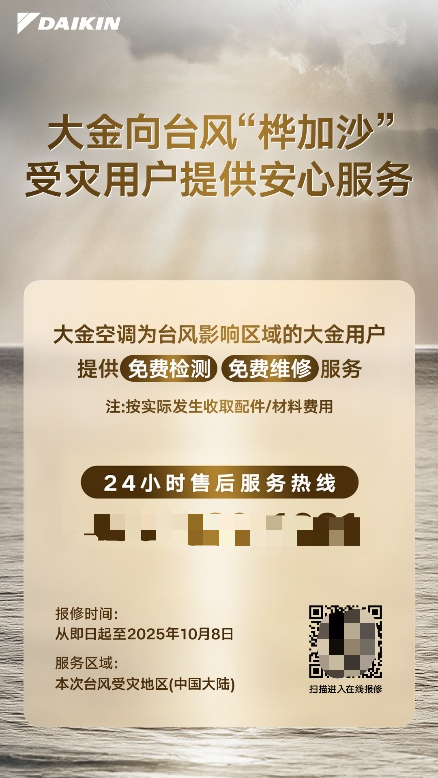 在超強(qiáng)臺(tái)風(fēng)樺加沙登陸我國(guó)華南地區(qū)之際,全球知名空調(diào)品牌大金官方發(fā)布:從即日起至10月8日,向臺(tái)風(fēng)樺加沙在中國(guó)大陸受災(zāi)地區(qū)用戶提供免費(fèi)檢測(cè)、免費(fèi)維修等服務(wù)*。這無疑為廣大大金用戶送去了一顆“定心丸”。