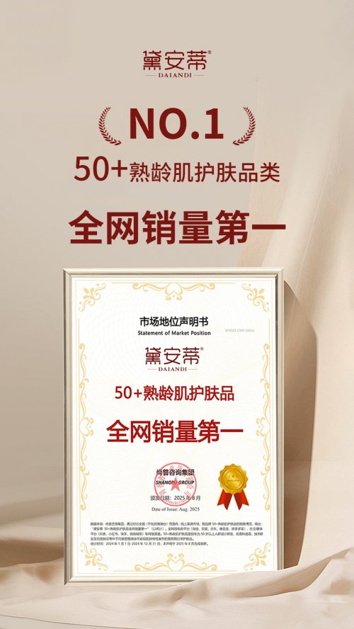 新聞摘要:面對50+熟齡肌護膚市場 “供給空白” 困境,專注該領域的國貨品牌黛安蒂,精準錨定熟齡肌膠原蛋白流失、屏障功能衰退、活性成分吸收難等核心痛點,以 “草本智慧+現代科技” 打造白細胞膠原雨淋乳、靈芝活性肽精華油、海茴香臻奢緊致溯顏麒麟竭膏等特色產品矩陣,并憑借 99.6% 客戶好評率、2024年全網銷量954噸的成績,斬獲尚普咨詢 “50+熟齡肌護膚品類開創者”“全網銷量第一” 雙認證,為熟齡群體提供科學抗衰解決方案,推動行業向精準化細分發展。