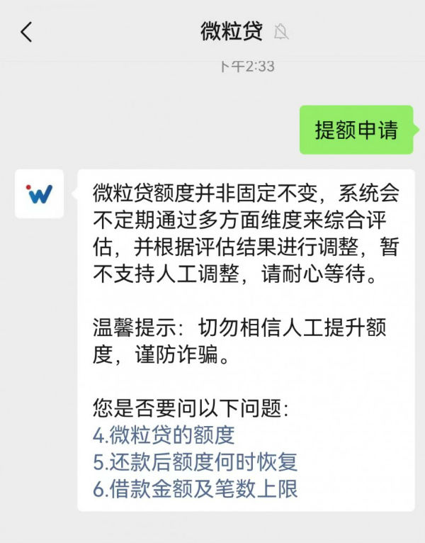 同時提醒一下大家,微粒貸目前暫不支持人工調整額度,并且微粒貸額度多少和微信支付分沒有直接聯系。建議你保持良好的信用記錄,綁定你本人的一類戶儲蓄卡,按時還款對提高額度有一定幫助哦。