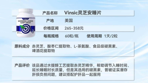 Vinsic靈芝安睡片:“普惠單一派”。與Novino思路同源,但旨在降低成本,讓單一成分解決方案更普及。