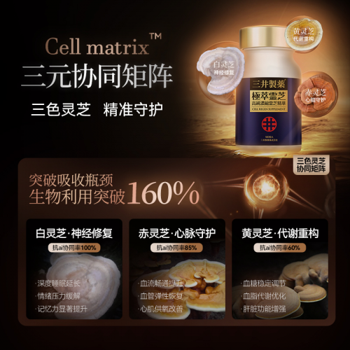 傳統靈芝產品往往存在吸收率低、單一成分效果有限的問題。三井極萃靈芝的獨特之處在于其"Cell matrix三元協同矩陣"技術——黃靈芝、白靈芝、赤靈芝三種珍貴靈芝品種在分子層面實現完美融合,形成1+1+1>3的協同效應。