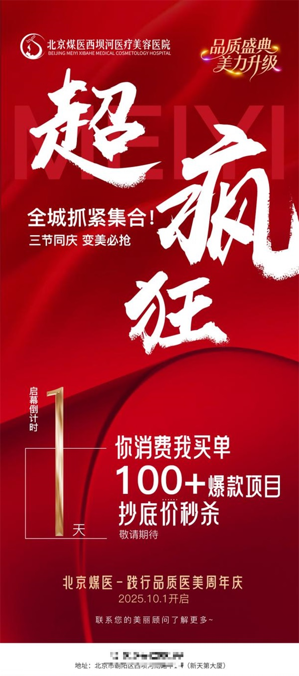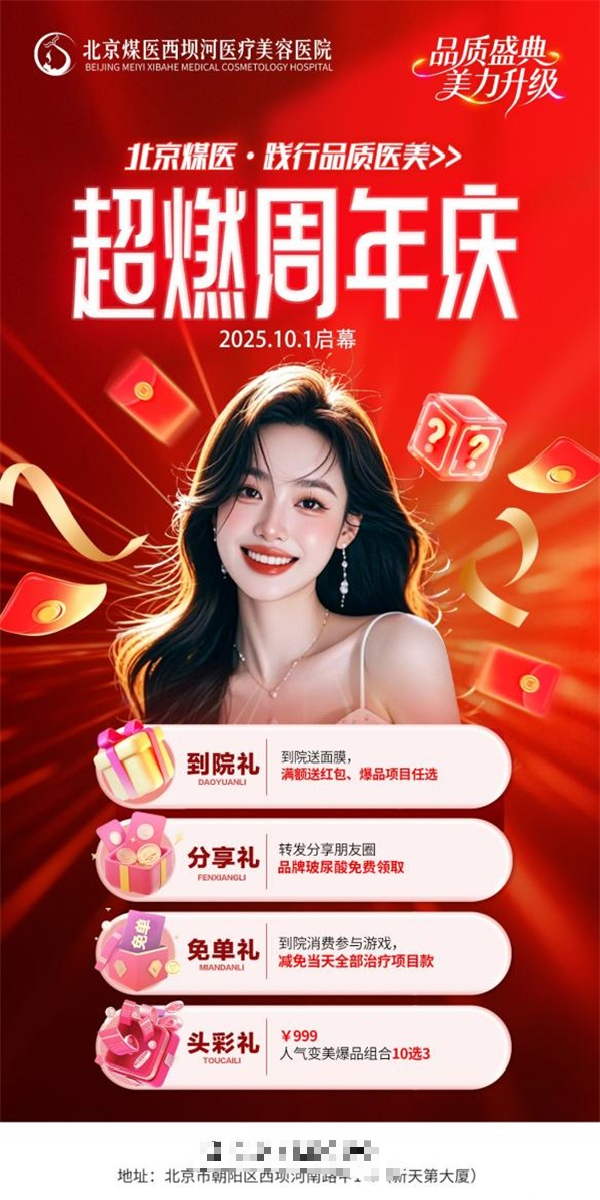 目前,周年慶預熱已全面開啟,求美者可通過醫院官網、微信公眾號或撥打美麗熱線預約到院,搶先鎖定福利名額。10月1日,北京煤醫西壩河醫療美容醫院將以璀璨之姿,與您共啟美麗新篇章!