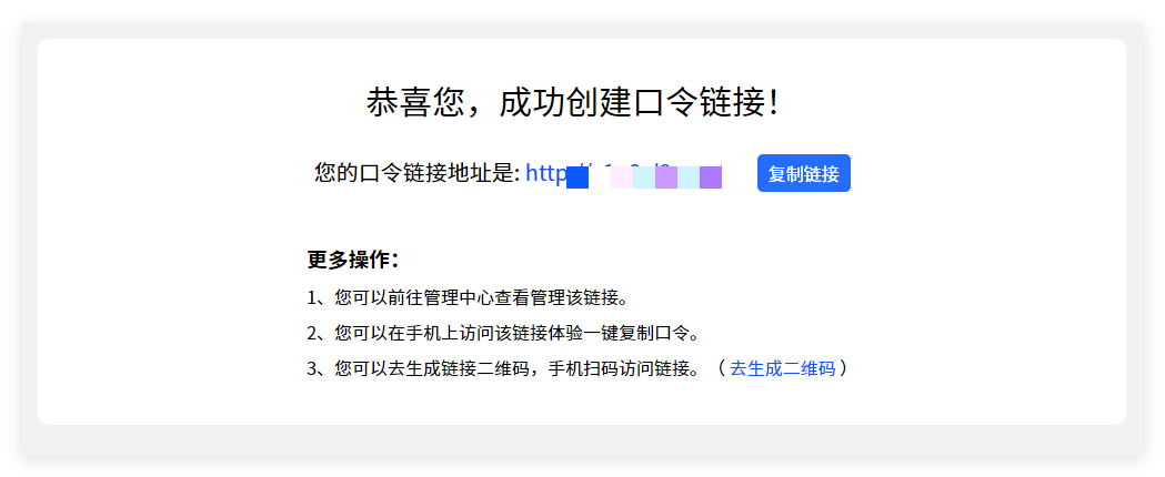 2.3、將生成的口令鏈接輸入到網址鏈接輸入框內,并點擊生成二維碼,即可實現將口令轉換成二維碼;