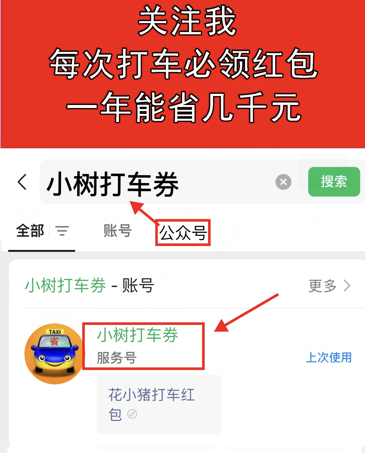 (1)打開微信,搜索 “小樹打車券”,關注公眾號;